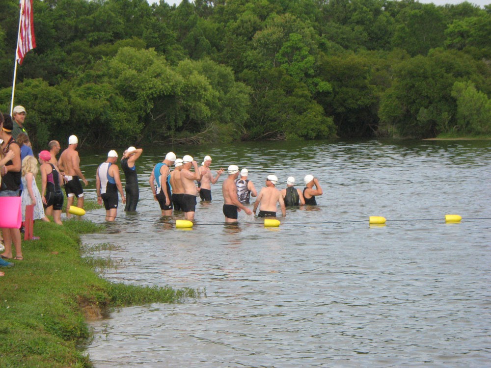 Before I knew it, the elites were in the water. My group would be starting about 20 minutes later. That 20 minutes flew by, and soon I was in the water waiting for my group’s start announcement. One cool thing about tris is that everyone’s age gets written on their body in permanent ink; it’s easy to see who’s in your age group. My group (age 45-49) started together, all wearing white swim caps (that’s me in the blue top):